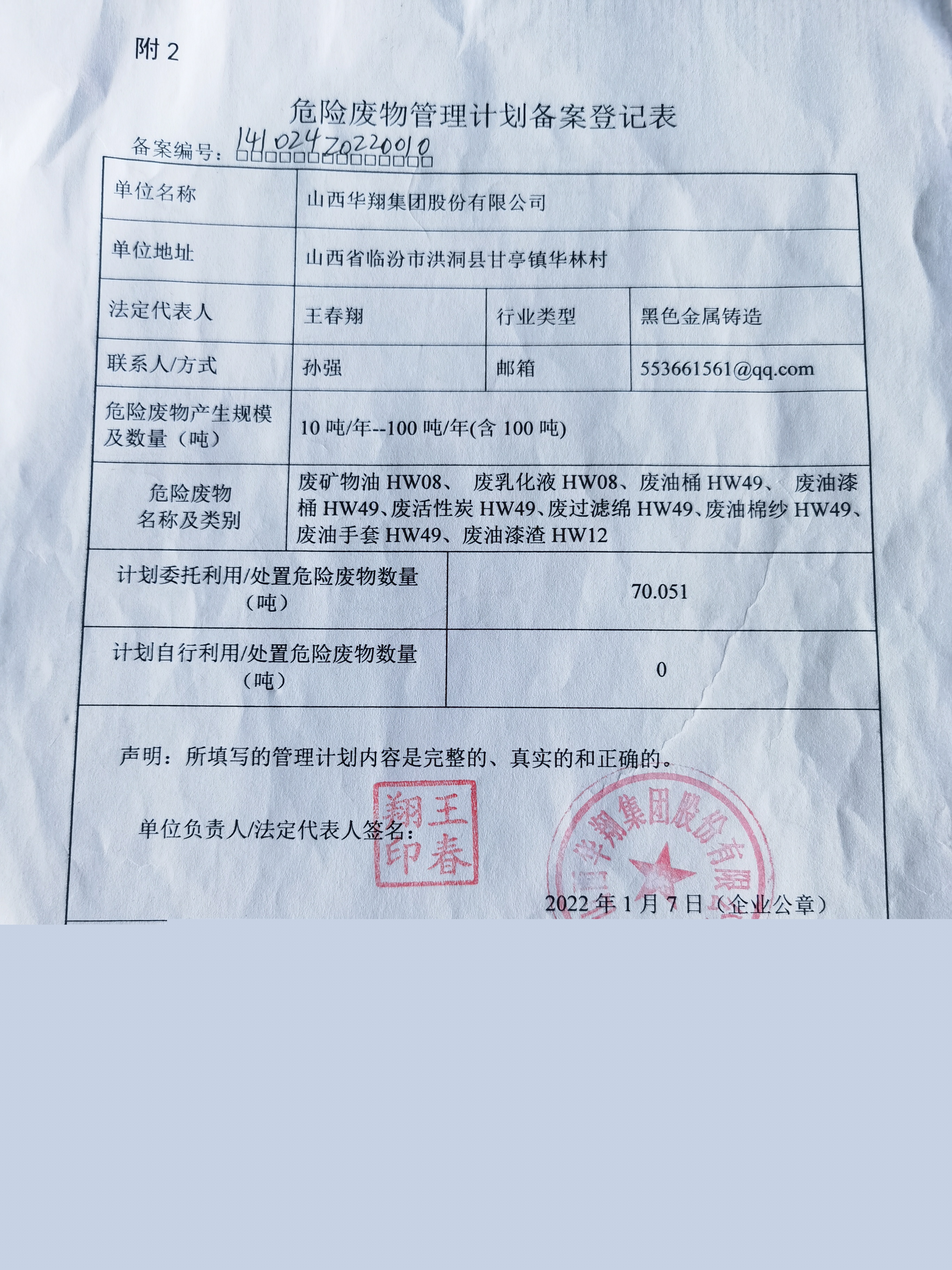 山西華翔集團股份有限公司危險廢物污染防治責(zé)任信息公示
